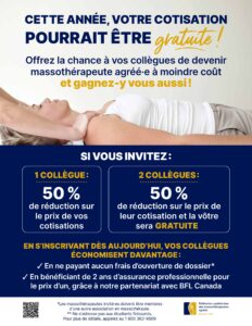 The principle is simple: if a member sponsors another massage therapist to join the FQM, both receive a 50% discount on their membership fee. Moreover, if the FQM member sponsors two new members, their membership is free! In all cases, new members benefit from waived administrative fees for opening a file and receive one year of insurance offered by our partner BFL Canada.